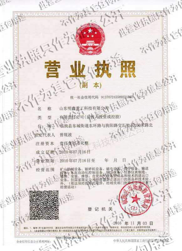 山東明鑫重工科技有限公司為是集科研開發,設計制造、銷售、安裝、調試為一體的技術制造企業。公司位于美麗的國際風箏都-濰坊市(國家AAAA級森林公園-沂山景區駐地)臨朐東城工業園。本公司產品種類有:破碎機設備,(電磁、永磁)除鐵器設備,磁選機設備,篩分設備,輸送設備,給料機設備,水泥自動化控制設備、除塵設備,儀器儀表等產品。其產品有五十多個系列,四百多種規格,并可根據客戶需求設計生產相應的產品。其產品廣泛應用于冶金、電力、煤炭、礦山、造紙、食品、化工建材、耐火材料、磚瓦、水泥、玻璃等行業,產品暢銷國內三十多個省市、自治區。