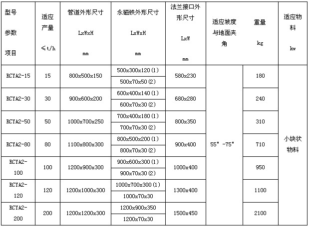 RCYA1、RCYA2系列管道式永磁除鐵器包括無磁管道和永磁鐵兩部分,****于對封閉管道內(nèi)非磁性物料除鐵、永磁除鐵器內(nèi)部采用高性能稀土強磁材料組成復合磁系。具有體積小、磁力大、重量輕、除鐵干凈、方便、無能耗、使用壽命長等特點。適合于無輸送皮帶,只能提供下料溜槽的場合。當散狀物料經(jīng)過管道式永磁除鐵器時,鐵雜物被高場強的永磁鐵所吸附,清除鐵雜質(zhì)時,打開管道****門將雜質(zhì)取出。該設備適用于含鐵量較少的場合,含鐵較多的場合,應選用自卸式除鐵器或RCYG系列精細除鐵器。主要應用于水泥、化工、煤炭、塑料、耐火材料、建材等行業(yè)的下料管道中清除雜物。